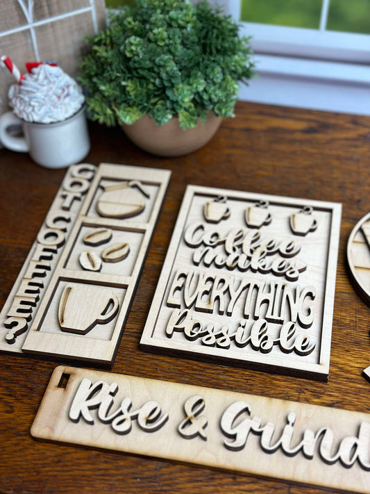 Coffee Time, Interchangeable Coffee Themed DIY Craft Kit with Unfinished Birch or Maple Plywood Cutouts