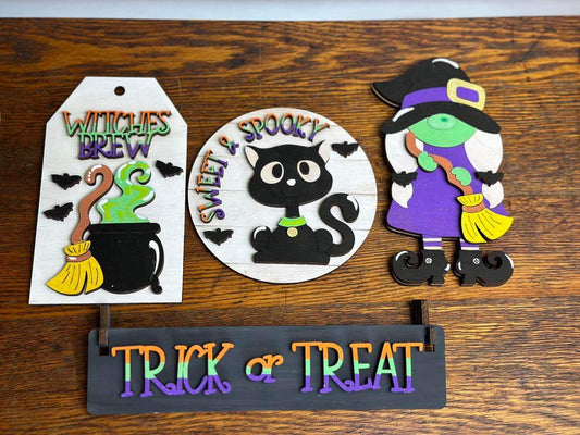 Trick or Treat, Halloween Witch & Cat DIY Craft Kit – Interchangeable Wood Signs for Tiered Tray, Crate, Wagon or Shelf Decor – Unfinished Halloween Paint Kit